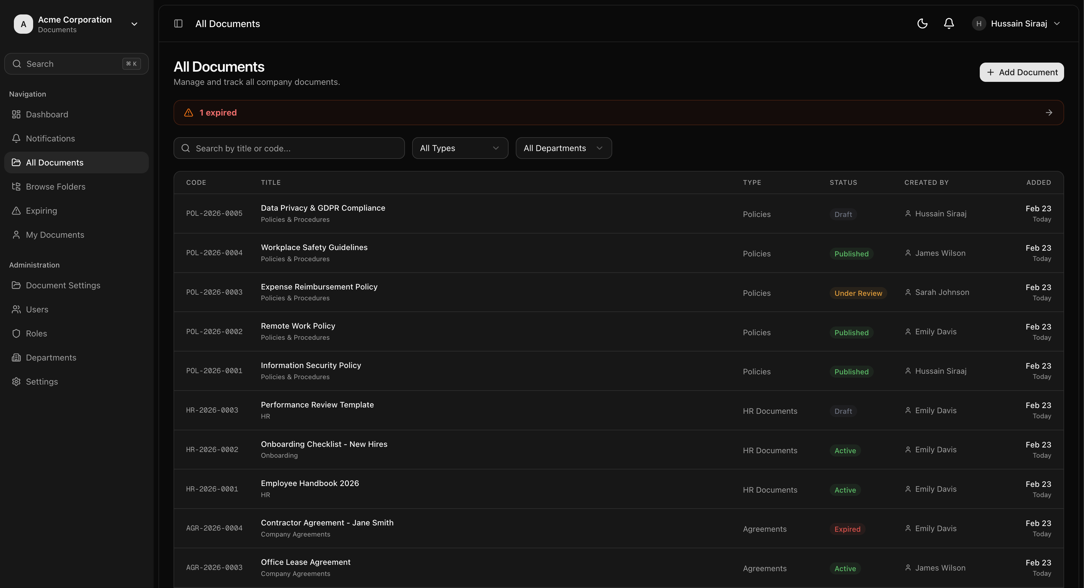 Create custom document types with unique code prefixes and configurable statuses. Add tags for quick categorization and filtering.