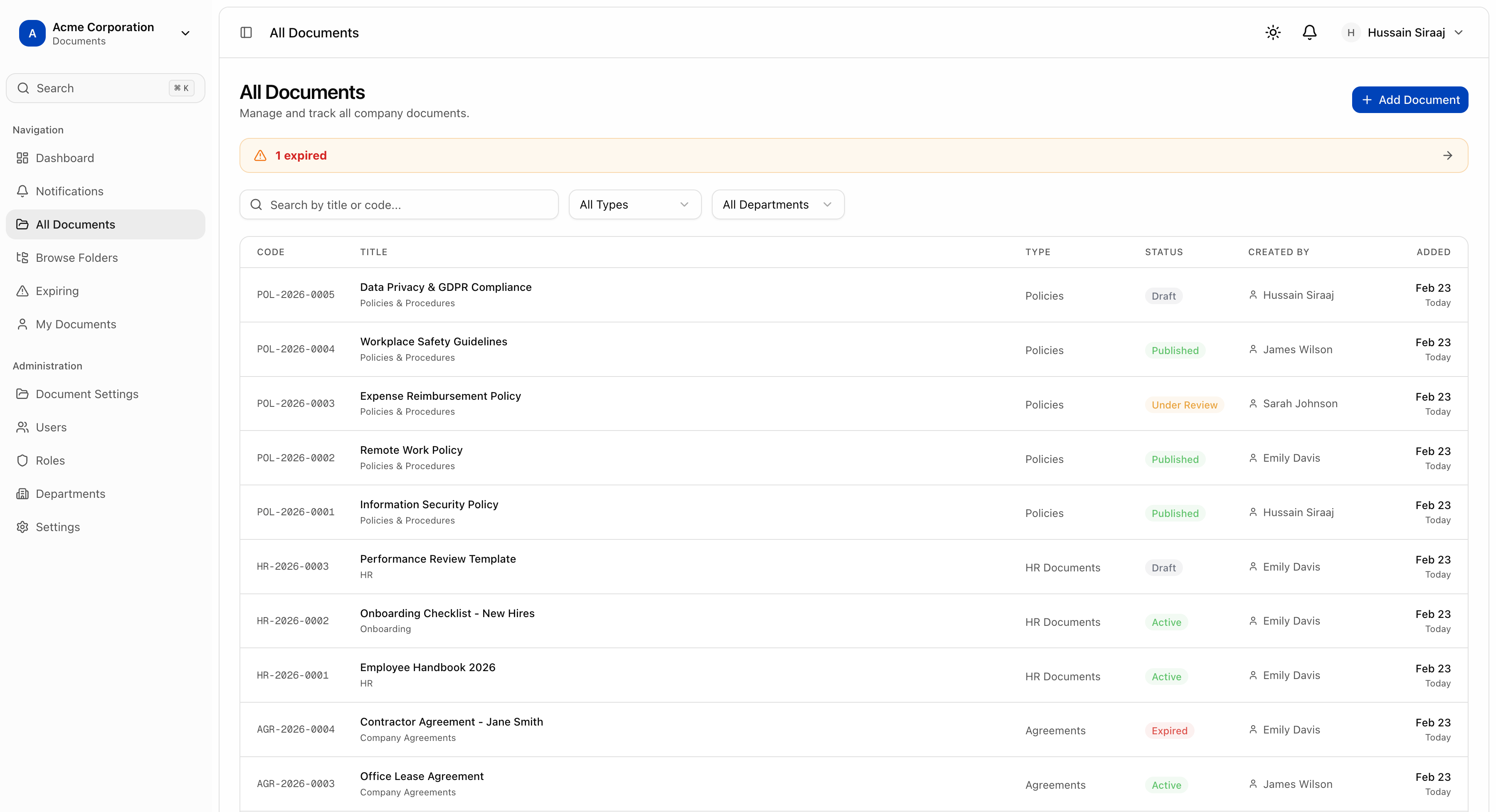 Version control keeps every change. Set expiry dates, manage statuses, and maintain complete audit trails.